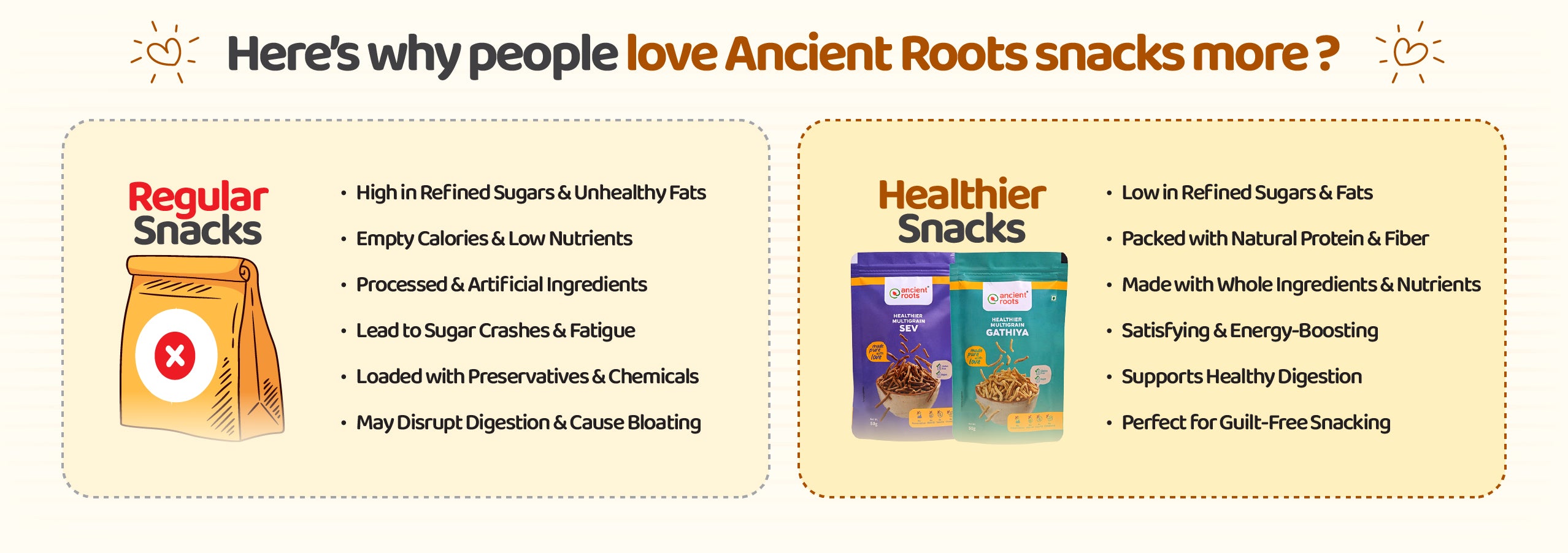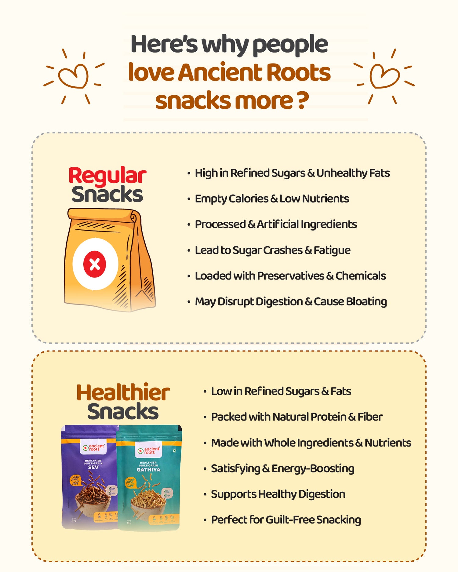 At Ancient Roots, we believe in clean ingredients, good fats, and promoting mindful eating. Our nutrient-dense foods, made from natural ingredients like millets, jaggery, wheat, oats, seeds, and nuts and offer a better alternative to the unhealthy but convenient food options readily available.