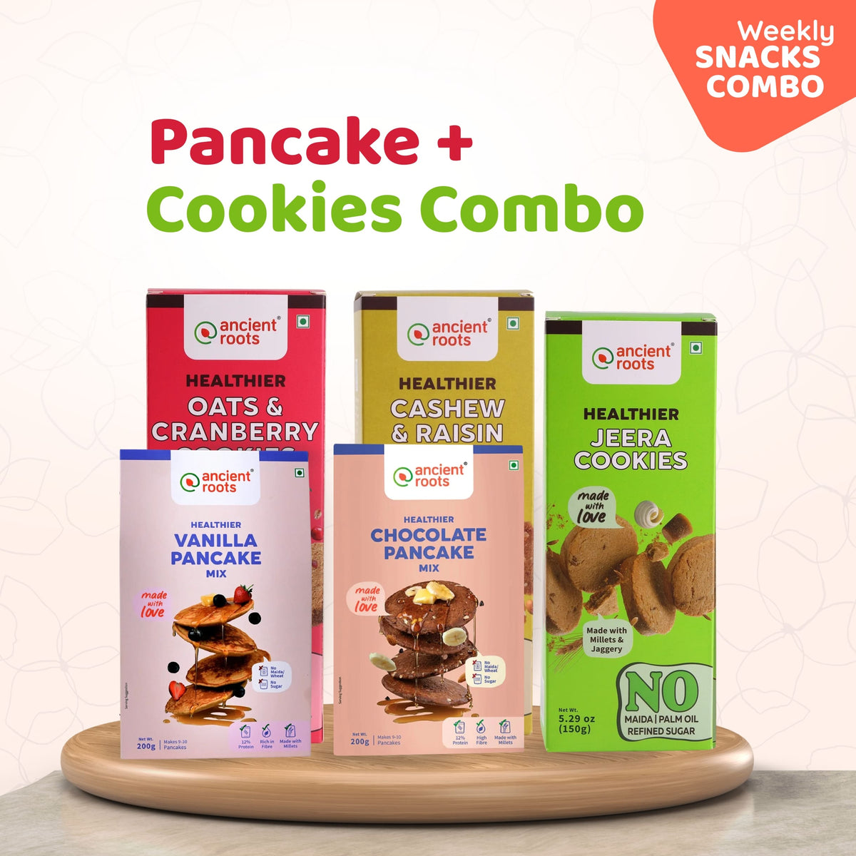 Enjoy the perfect balance of taste and nutrition with our Ancient Roots Weekly Snacks Combo – a wholesome mix of healthy pancakes and traditional cookies made with real, nourishing ingredients.