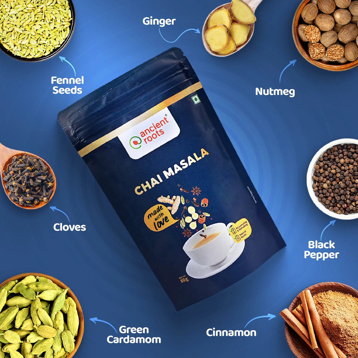 Experience the magic of our beloved Chai Masala, carefully crafted with a delightful mix of Cardamom, Nutmeg, Cinnamon, Cloves, Fennel Seeds, Black Pepper and, of course, the fiery essence of Ginger!