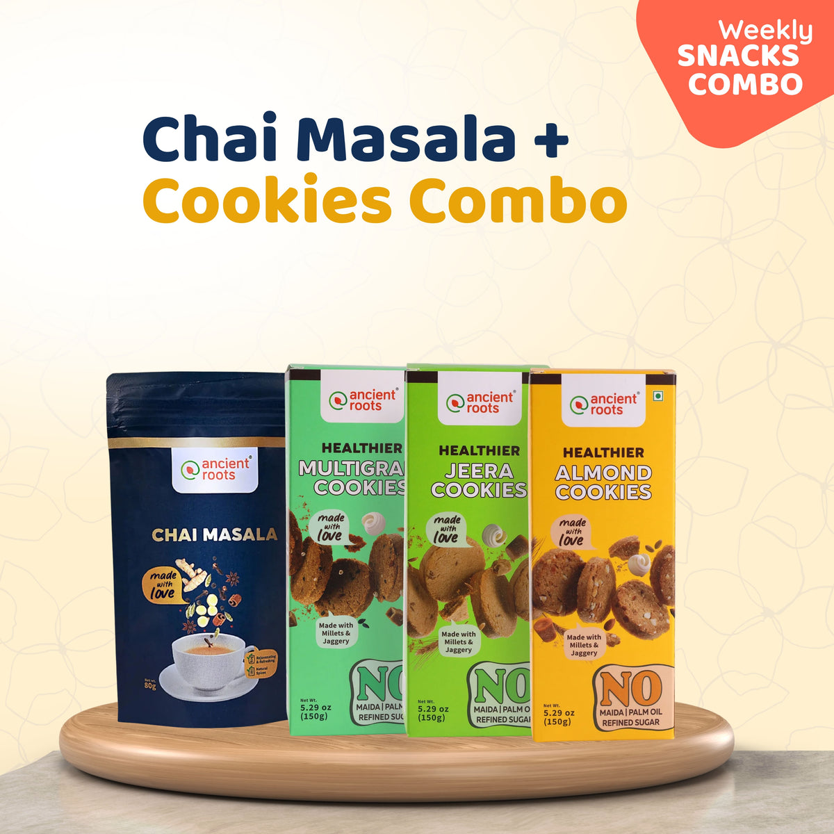Elevate your everyday tea moments with our thoughtfully curated Chai Masala + Cookies Weekly Snacks Combo - a comforting blend of authentic Indian spices and wholesome, guilt-free cookies.