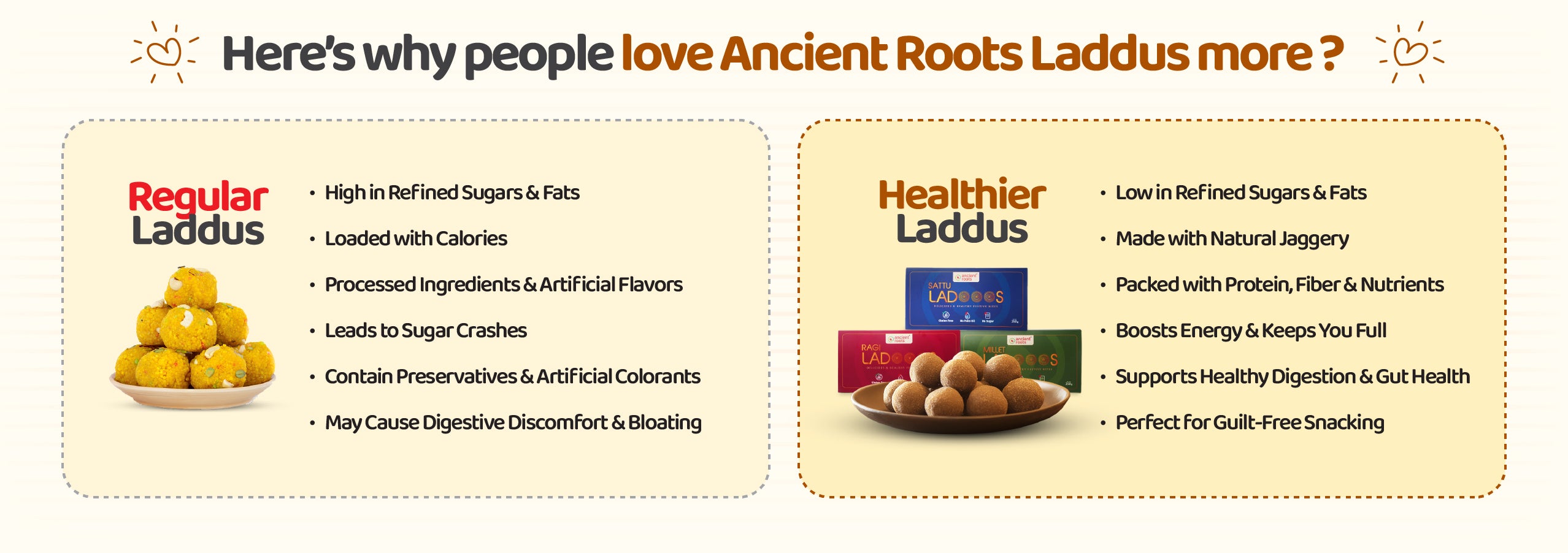 Ancient Roots Ladoos are made with natural ingredients like whole wheat flour, jaggery, and almonds. Unlike regular ladoos that often contain refined sugar, artificial sweeteners, or preservatives, our ladoos are free from any harmful additives. We use ingredients that are good for your body and promote overall health, making our ladoos a healthier choice for both adults and kids.