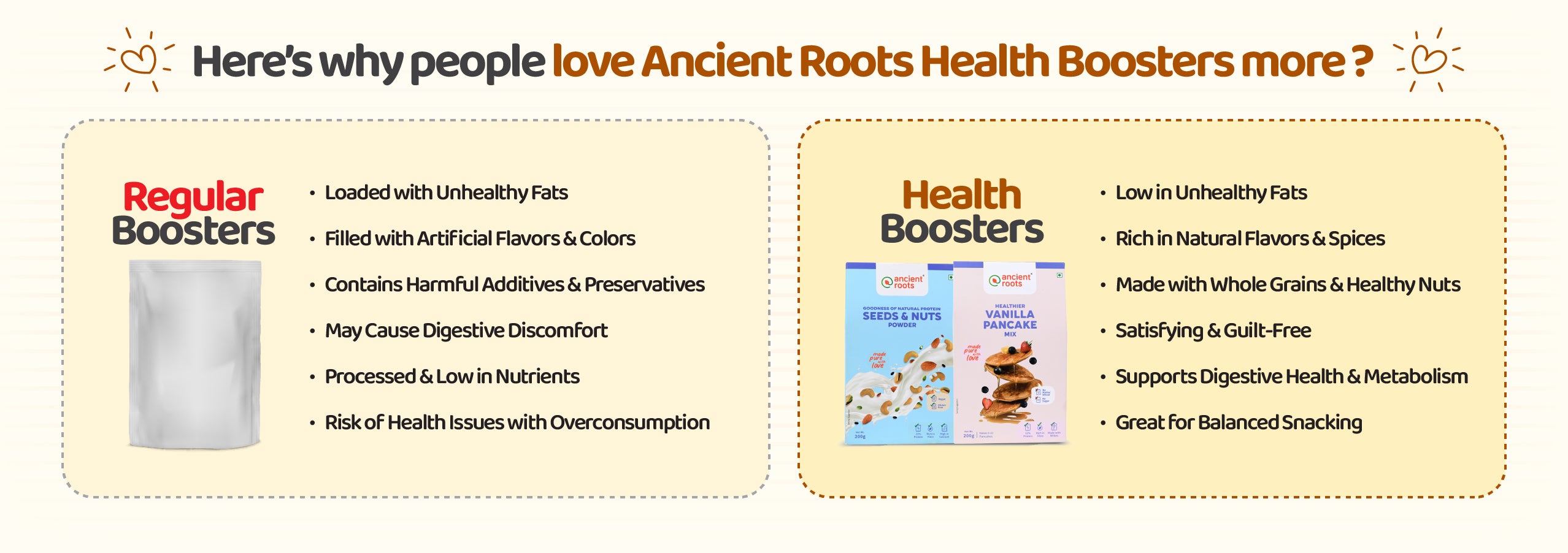 At Ancient Roots, we believe in clean ingredients, good fats, and promoting mindful eating. Our nutrient-dense foods, made from natural ingredients like millets, jaggery, wheat, oats, seeds, and nuts and offer a better alternative to the unhealthy but convenient food options readily available.