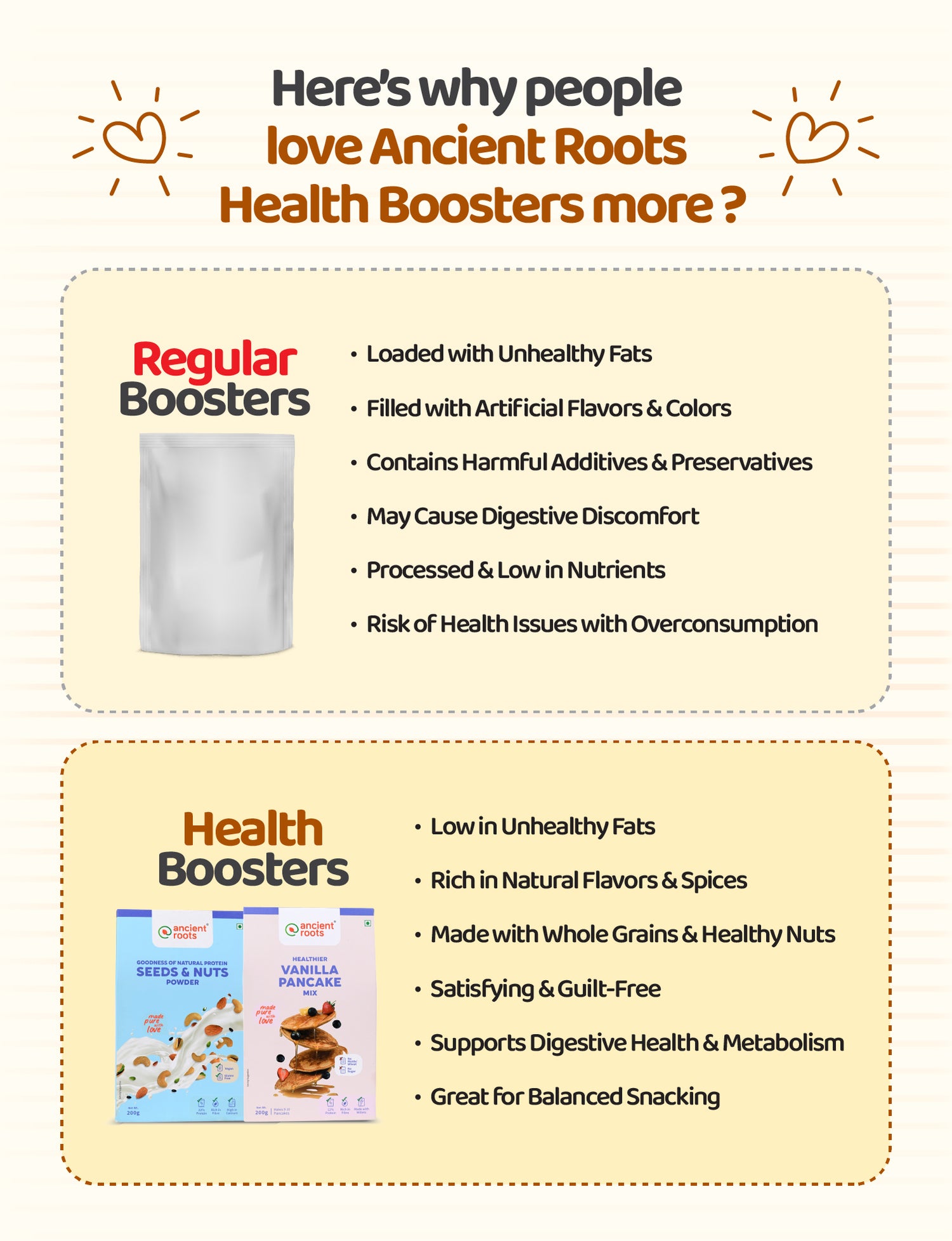 Ancient Roots Seeds and nuts powder are prepared by using a 100% natural powdered blend of watermelon, almonds, cashew, pistachio, pumpkin, lotus, and flax seeds that contain healthy fats. Adding it as a part of your diet helps in healthy weight gain for kids and adults.